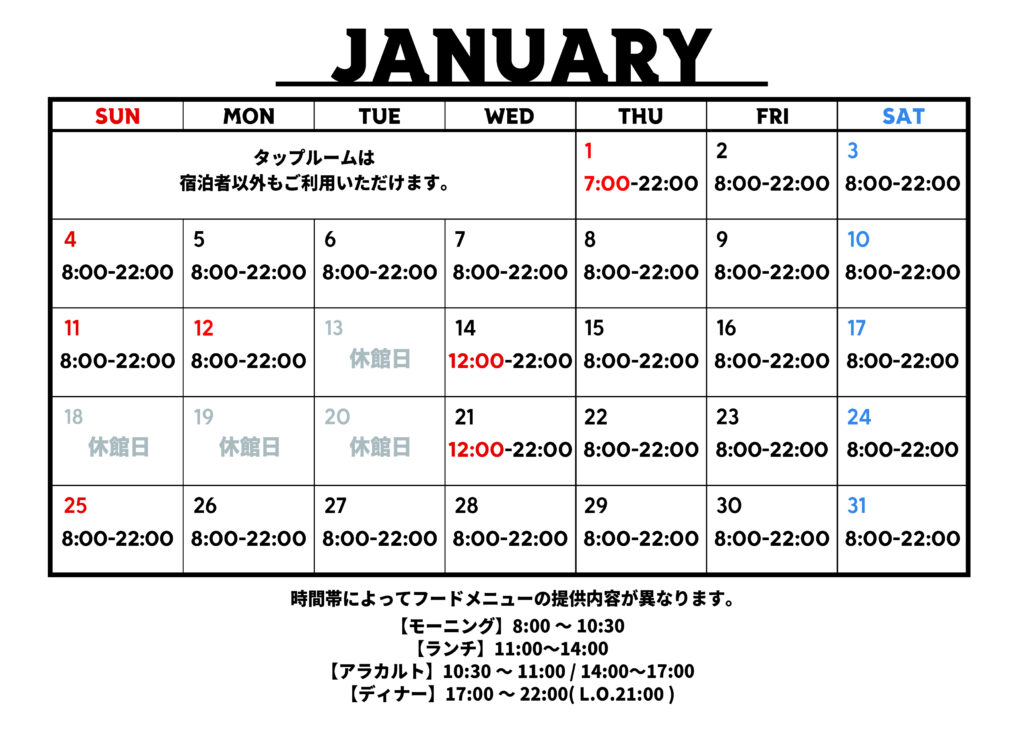 ▼1月のタップルーム店休日