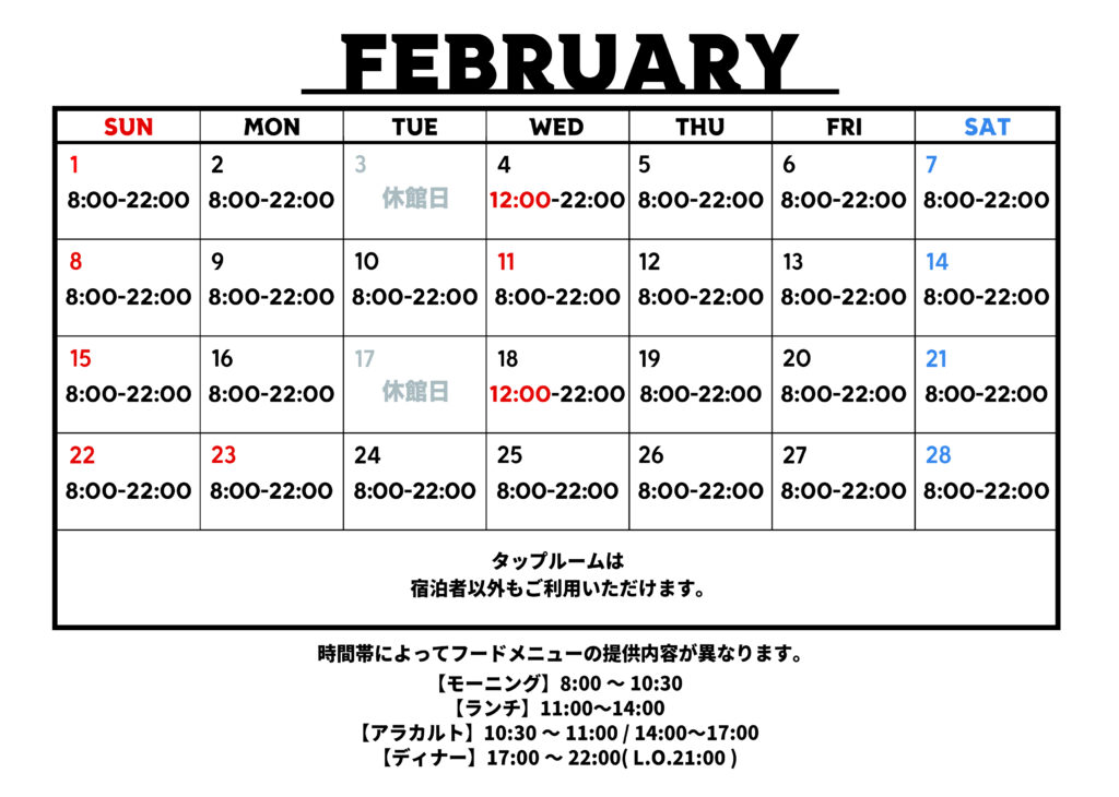 日頃より、WCB用宗タップルームをご利用いただき、誠にありがとうございます。2月のタップルームの営業スケジュールをお知らせいたします。