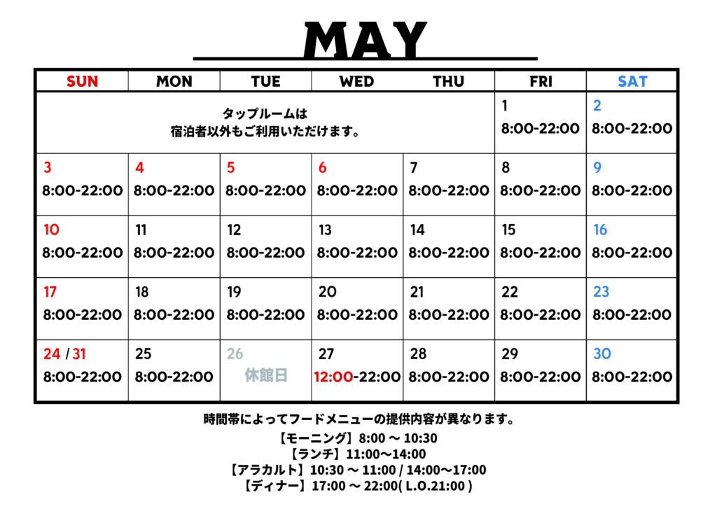 日頃より、WCB用宗タップルームをご利用いただき、誠にありがとうございます。5月のタップルームの営業スケジュールをお知らせいたします。